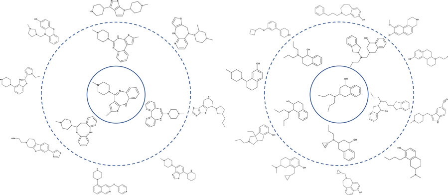 值得说明的是,上述生成过程是随机的,即由一种属性设定可以生成多种分子结构,越是符合目标属性的分子,生成的可能性越大。如下图所示,左右两图分别是基于两种属性设定生成的分子结构。可以看到每种设定都可以生成多种分子结构,这些结构具有相似属性,因而都是可能的新药候选。制药师可以对这些候选进行筛选,选择可能性较大且成本较低的结构进行试制。这一方法可充分启发研究人员的思路,从而有效缩短发现新药的时间。