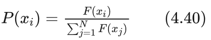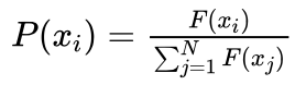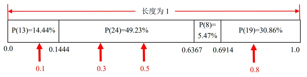 艾博士:首先我们简化“轮盘赌”,假定每次最多转一圈。或者说,前面转的若干完整的圈对于最终选中了哪个扇区没有关系,我们只关心最后一圈(实际上是0到1圈之间)就可以了。我们将转盘的扇区展开成一个长度为1的长条,长条被划分为N块,每块对应群体中的一个个体,每块的大小为对应个体被选中的概率。其中个体xi被选中的概率由下式给出: