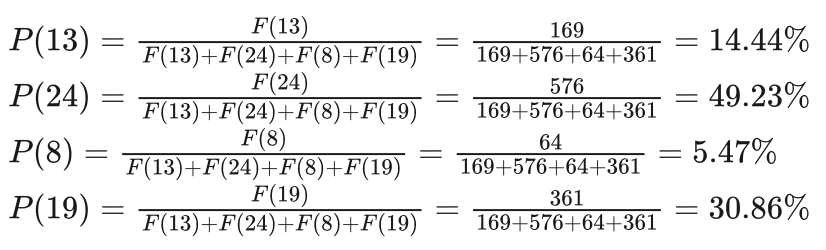 艾博士接着讲解说:为了叙述方便,我们将个体xi被选中次数的期望值划分为整数部分和小数部分,其中整数部分用ei(xi) 表示,小数部分用 ef(xi)表示。比如x=24被选中次数的期望值为1.97次,则 ei(24)=1 ,ef(24)=0.97 。