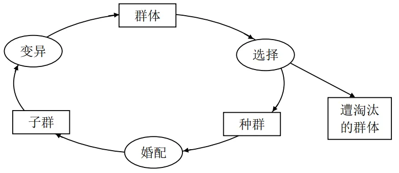 该进化圈以群体为一个循环的起点。按照优胜劣汰的原则,经过自然选择后,一部分群体由于无法适应环境而遭淘汰退出进化圈。在自然界中,自然选择包括恶劣的天气和气候、食物的短缺、天敌的侵害等。另一部分群体,由于适应环境的能力强而生存下来。它们或者是因为身体强壮而逃脱天敌的侵害,或者因为耐寒冷、耐饥饿能力强而存活下来。总之,这些群体之所以能够生存,是因为它们具有某种适应周围环境的能力。从适应环境的能力方面来说,这些群体从总体上考察是优良的,被淘汰的是那些体弱病残、不能适应环境生存的个体。即便因偶然因素一些弱者侥幸生存了下来,但在婚配的竞争中它们也往往处于劣势。因此可以说只有那些适应环境能力强的优良品种才能够成为新的种群。经过种群的婚配,繁衍出下一代子群。一般来说子群中的个体遗传了父母双亲的优势,加快了后代的进化,使之更能够适应环境。比如,一个身体强壮的个体和一个耐寒冷能力强的个体繁衍的后代可能会同时具有身体强壮和耐寒冷的能力。在进化的过程中,个别的个体可能会发生一些变异,从而产生新的个体,使得群体的组成更加多样化。综合以上过程,经过一个循环的进化,新的群体生长起来,取代旧群体,又进入新的一轮进化之中。经过长期的竞争、淘汰、进化过程,最终的群体中生存下来的是那些最能适用环境生存的优秀个体。