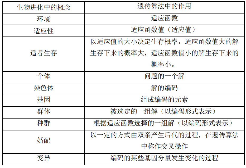 表4.7给出了遗传算法与生物进化之间的对应关系。