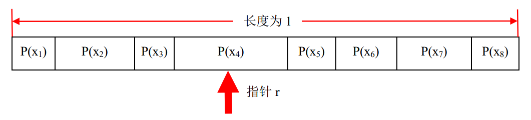 如图4.18所示是一个含有8个个体的“轮盘赌”示意图,设想有一个指针r沿着长条从左到右移动,当指针停止时,指针所指向块所对应的个体就是被选中的个体。