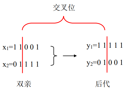 例如,对于 x1=11001 和 x2=01111 两个染色体,当交叉位等于2时,产生两个后代染色体 y1 和 y2 :
