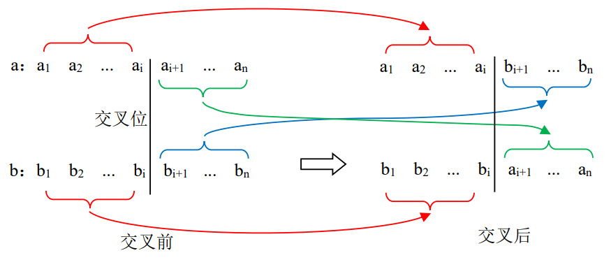 从图中可以看出,后代1的染色体由两部分组成,交叉位之前部分来自双亲1,而交叉位之后部分来自双亲2。而后代2刚好与后代1相反,交叉位之前部分来自双亲2,而交叉位之后部分来自双亲1。