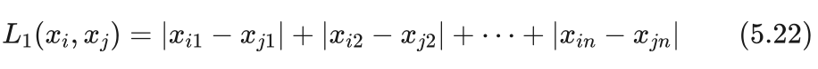 曼哈顿距离是样本xi 和样本 xj 对应特征值之差的绝对值之和,即: