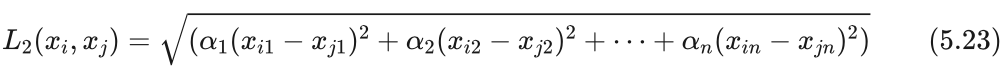 加权欧氏距离顾名思义就是在计算距离时,每个平方项具有不同的权重 αk ,即: