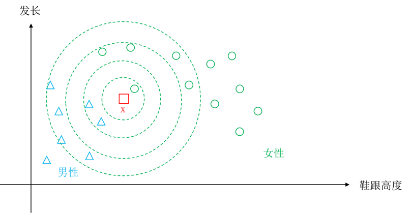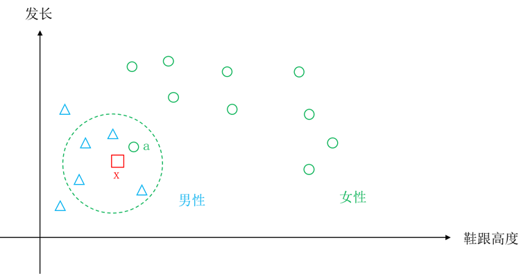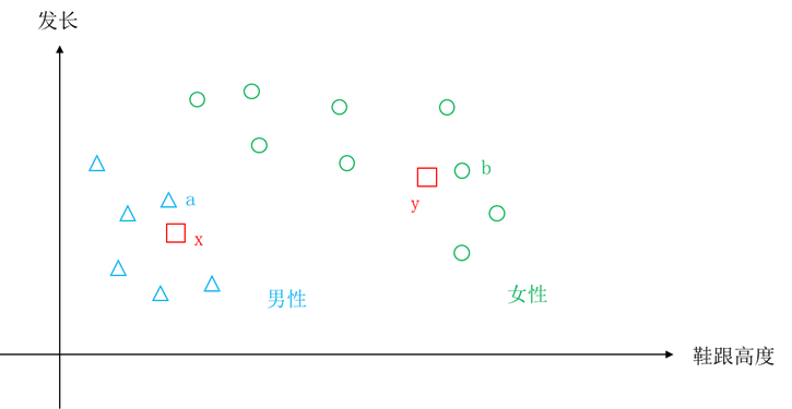 比如男女性别分类问题,我们假定有发长和鞋跟高度两个特征,取值为发长和鞋跟高度的实际值,这样[发长,鞋跟高度]就可以构成平面空间的一个点,如图5.21所示。其中“△”为训练集中男性样本的坐标,“○”为女性样本的坐标,x和y为两个待分类样本。从图中可以看出x距离样本a的距离比较近,而y距离样本b的距离比较近,而样本a、b分别为男性和女性,所以有理由认为x的类别为男性,y的类别为女性。
