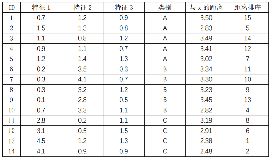 表5.5前5列给出了具有15个样本的数据集,其中第1列是样本ID,第2到第4列给出了每个样本的三个特征取值,第5列是每个样本的所属类别。第6列给出了每个样本与待分类样本x=(3.5,3.3,0.8)的距离,第6列给出了按照距离排序后的序号。从表中可以看出,当k取值为5时,与x最近的5个样本ID分别为13、14、15、10、2,其中ID为13、14、15的三个样本类别为C,ID为10的样本类别为B,ID为2的样本类别为A。按照k近邻方法待分类样本x被识别为类别C。