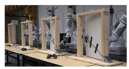 随着深度强化学习的兴起,一些机器人可以通过自我学习来学会完成一些简单的任务,如开门,抓取物品等。图4是Google的研究者利用4台机器人练习开门技巧的例子。值得说明的是,这些自动学习的机器人可以直接学习在特定状态下需要的力矩大小,因此不需要运动学和动力学计算。基于学习的机器人更加智能,但因为物理机器人的学习成本高,到目前为止还只能用于特定任务上。