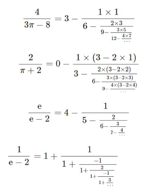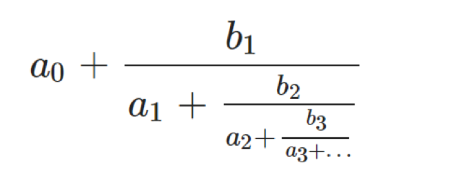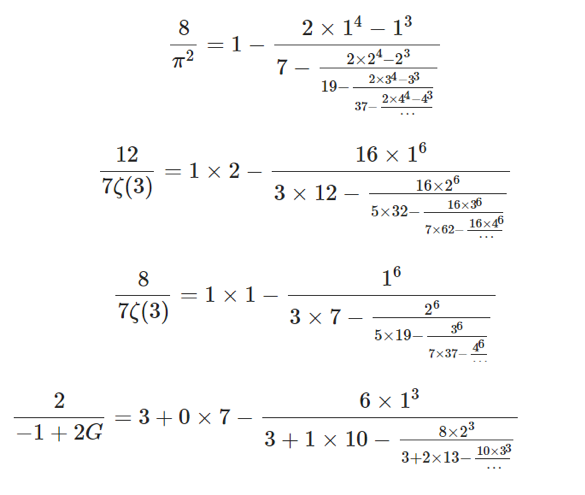 当前这个“拉机”仅关注一些数学常数的猜想,这些常数包括自然对数的底e,圆周论π等等。这些常数绝大部分是无理数(无限不循环小数),或有理无理未知的数(如卡塔兰常数G)。“拉机”用一个无限嵌套的除式来表示这些常数,形式如下: