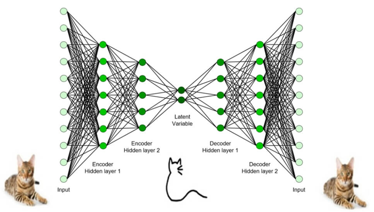 这个神经网络的学习目标是努力在输出层还原输入数据。如图1所示,输入一幅猫的图片,这个自编码器会努力在输出层还原这只猫。关键是,因为网络的中间层比较窄,必然会过滤掉一些信息,因此也称为信息瓶颈层。显然,为了尽可能恢复输入图片,网络在瓶颈层的编码中会尽可能地保留图片中的重要特征,例如猫的轮廓。因此,自编码器是一个强大的特征提取器,可以从数据中自动发现显著特征。自动从数据中发现特征这件事有重要意义,它不仅使人们摆脱了手工设计特征的压力,而且有望发现数据中隐藏的规律。