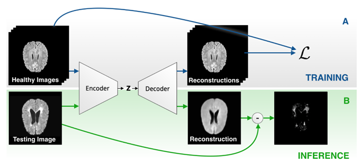 最后,因为自编码器对异常数据会产生较大的恢复误差,利用这一现象可以进行异常检测。如下图所示,用健康人脑部扫描图片训练出的自编码器,当输入一幅病人的脑部扫描图片时,在输出端会产生较大的残差,从而实现疾病的自动检测。