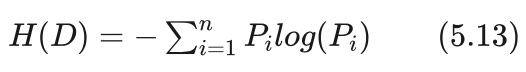 假设数据集由n个类别组成,每个类别的概率为Pi ,则该数据集D的熵H(D)由下式给出: