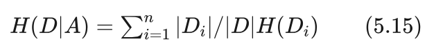 其中 |Di| 表示第i个子数据集 Di 的样本数,|Di| / |D|表示数据集D的样本数, 就是第i个子数据集 Di 占数据集D的比例, H(Di) 是第i个子数据集 Di 的熵,同样按照式(5.13)计算,只是数据采用第i个子数据集 Di 中的样本。
