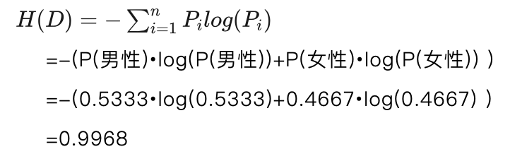 H(D)=-(男性概率∙log(男性概率)+女性概率∙log(女性概率))