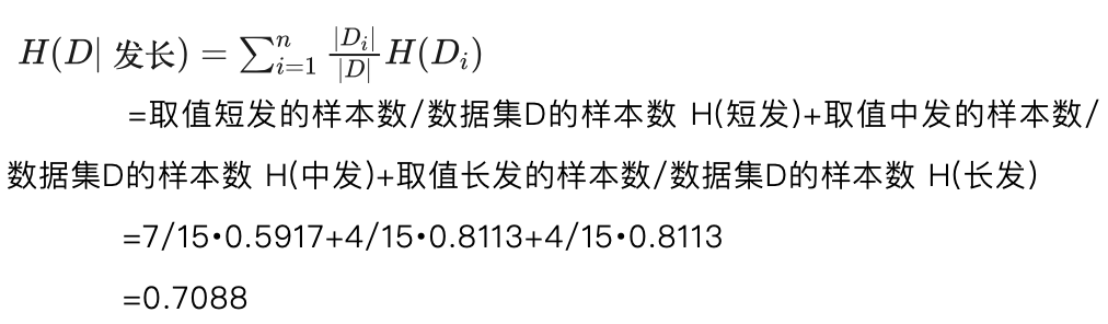 相应地,我们可以计算出取值中发、取值长发时子数据集的熵,下面我们直接给出计算结果: