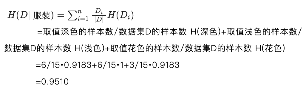 相应地,我们可以计算出取值浅色、花色时子数据集的熵,下面我们直接给出计算结果: