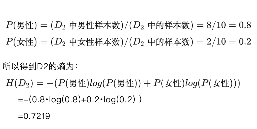 首先计算数据集D2 的熵。 D2 中共有10个样本{1,2,3,5,6,7,10,12,13,14},数字表示样本的ID,其中8个男性样本2个女性样本,所以男性、女性的概率分别为: