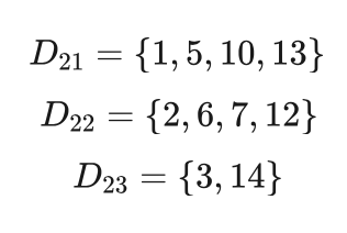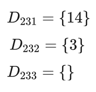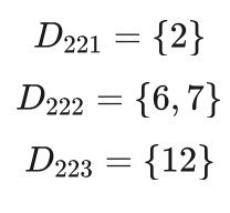 比较年龄、发长和服装三个特征对数据集 D2 的信息增益,服装特征的信息增益最大为0.1974,所以对于决策树的节点 d2 采用服装特征对其做划分,按照服装特征的深色、浅色和花色三个取值,得到数据集D2 的三个子数据集D21 、D22 和 D23 ,如果用样本ID的集合表示这三个子数据集,则有: