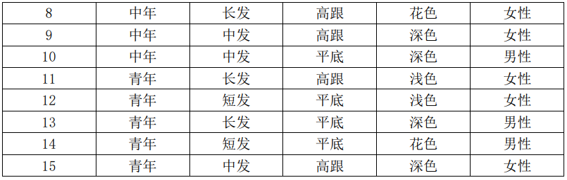 对于服装特征,共有深色、浅色和花色三个取值,其中取值深色的样本有4个,取值浅色的样本有4个,取值花色的样本有2个。