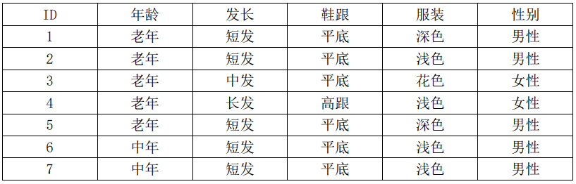 下面我们计算每个特征的信息增益。在计算信息增益时,要将鞋跟特征从特征集中删除,我们再一次计算年龄、发长和服装这三个特征的信息增益。