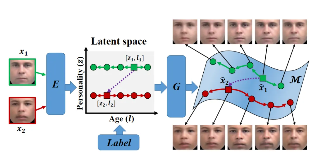 图1是Tennessee大学2017年的一篇论文中给出的方案[1]。在这一方案中,输入照片通过一个神经网络编码器E映射到隐空间中的点z,这个z代表了年龄以外的人脸信息。在z上附加一个表示年龄的信息l, 再经过一个神经网络生成器G,即可还原出和年龄l相匹配的照片。