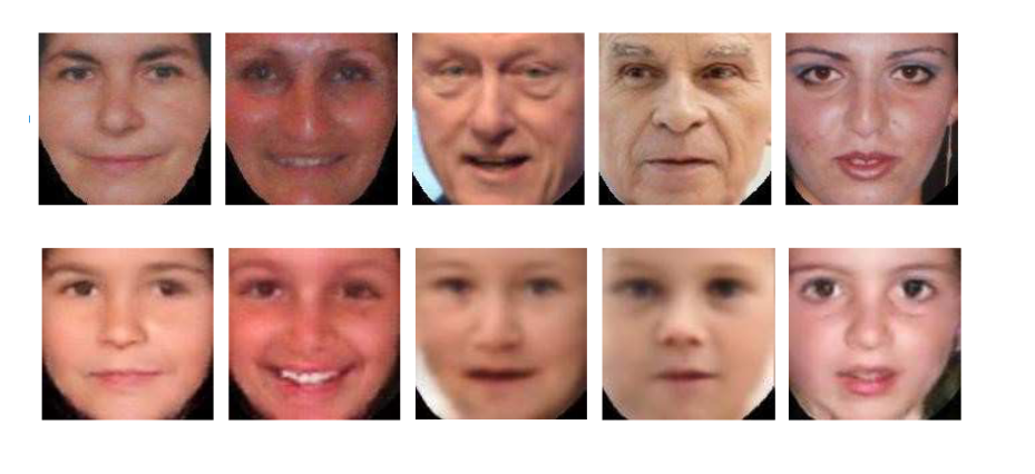 图2给出该模型的一个生成结果,其中上边是标注了年龄的照片,将这一照片作为输入;下边是生成的儿时照片,可以看到生成的照片还是很有相似性的。