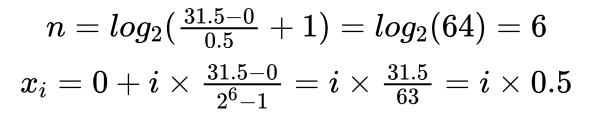 小明:这样修改x的取值区间后,离散化的x取值果然就是0.5的倍数了。但是如果不想改变x的取值区间,是不是可以这样处理:因为以0.5为间隔取值的话,则在[0,31]区间上x共有63个值,而6位二进制数可以表示 2^6=64 个数,我们只用其中的63个编码,比如丢弃111111这个编码,只用000000到111110这63个编码表示x的63个取值,是不是就可以了?