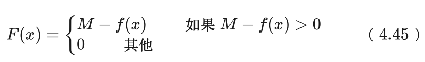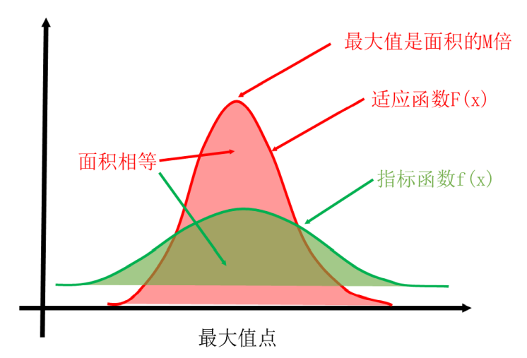 艾博士解释说:这两条原则,第一条是说适应函数和指标函数的平均值相等,第二条是说适应函数的最大值是指标函数平均值的M倍。在离散的情况下,平均值可以认为是按区间归一化后函数曲线下面的面积。适应函数最大值如果等于指标函数平均值的M倍,而面积又与其相等,则适应函数只能是又“高”又“瘦”的形状。如图4.38所示。