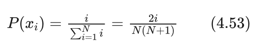 设群体规模为N,群体内个体按照其指标函数值从小到大排序,其序号分别为1到N。则排序在第i位的个体 xi 被选中的概率为: