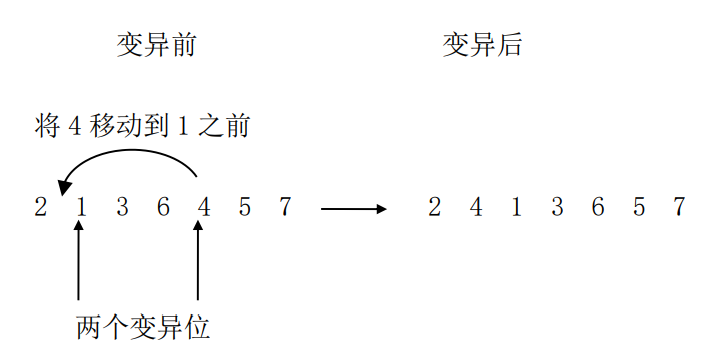 艾博士:该方法随机的产生两个变异位,然后将第二个变异位上的基因移动到第一个变异位之前。例如下面的例子,假定两个变异位分别为2和5,则对于如下的整数编码,变异前后的变化如下: