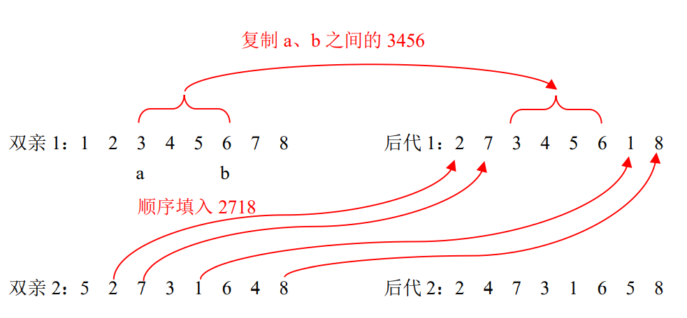 艾博士:常规交叉方法我们还可以给出更一般的形式。在下面的的例子中,假设随机选取的两个交叉位是a和b。当a小于b时,将双亲1中a、b之间的基因直接复制到后代1中,这样后代1中还缺少1、2、7、8四个基因,按照这四个基因在双亲2中的位置,顺序填入到后代1的相应位置中。这样我们就得到了了后代1为27345618。同样的方法我们也可以得到后代2为24731658。