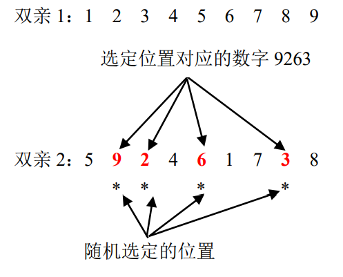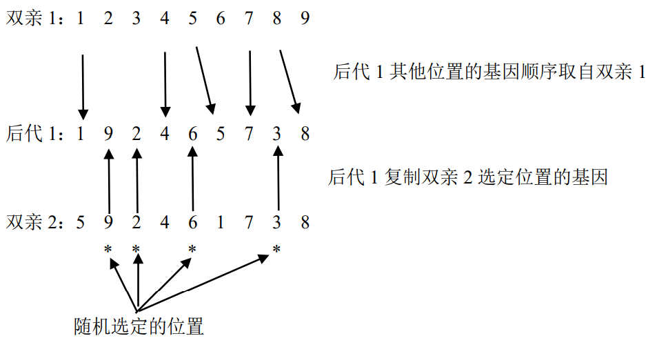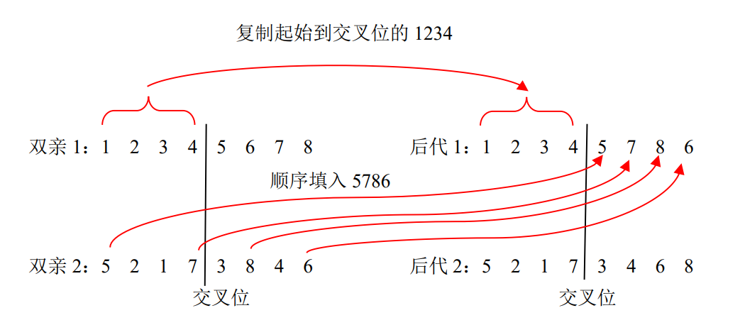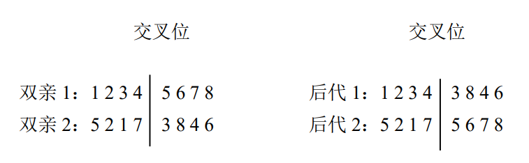 例如下面这个例子,采用类似于双亲双子法的交叉操作,将双亲1交叉位前的基因与双亲2交叉位后的基因拼接在一起得到后代1: