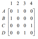 对于n个城市的旅行商问题,可以用一个矩阵来表示一个可能解。比如对于4城市的旅行商问题,如下的矩阵可以表示一个可能解。