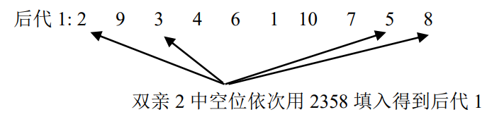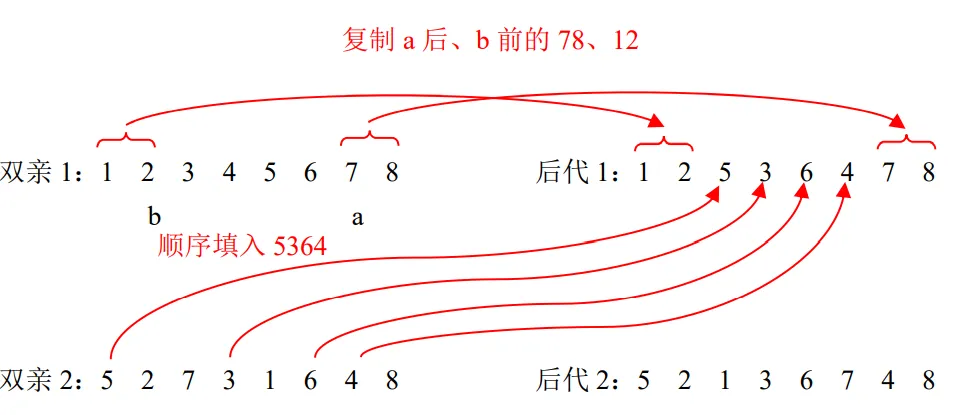 在这个例子中,后代1交叉位前的4个基因1234选取自双亲1的前4个基因。这样后代1就已经有了1、2、3、4这四个基因,还缺少5、6、7、8这几个基因。然后在双亲2中找到5、6、7、8这几个基因,并按照他们在双亲2中的位置排列,得到5786这个基因次序,将这4个基因按顺序放到后代1的后四个位置,这样就获得了后代1的染色体12345786。对于后代2也同样处理,就可以得到后代2的染色体52173468。这样交叉得到的后代,由于每个用于编码的整数基因都出现了一次,并且只出现了一次,所以是满足旅行商问题的约束条件的。