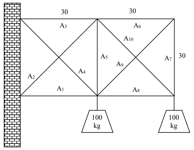 例:十杆桁架问题如图4.20所示,其中有10个截面积分别为 A1、A2、...、A10 的杆组成。该桁架由左边的墙支撑,并且它必须承受如图所示的两个负载。每个杆上的应力必须控制在一个允许的范围内,该范围由该杆的应力以某种约束形式表示。问题是如何设计每个杆的截面使得建造该桁架的材料总费用最小。