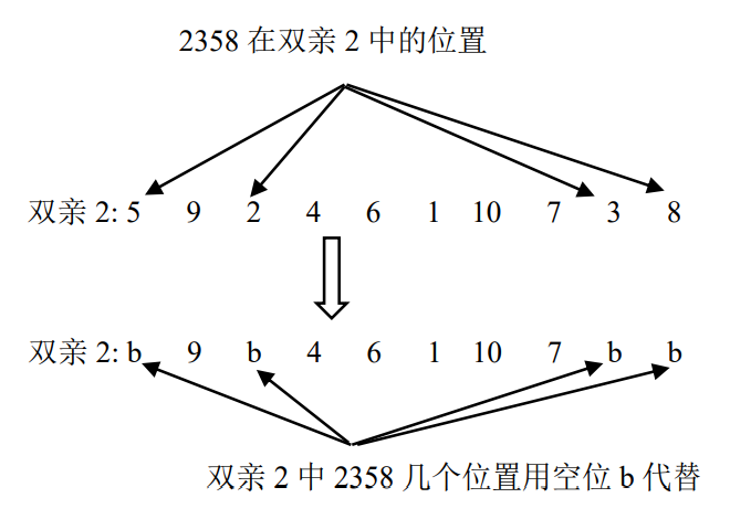 例得到的基因对应对为:3:7、8:6、1:2。然后按照该对应关系分别去替换双亲1和双亲2中的基因,也就是说,原染色体中的基因3用7替换、基因7用3替换,8用6替换、6用8替换,1用2替换、2用1替换。这样就得到了两个后代: