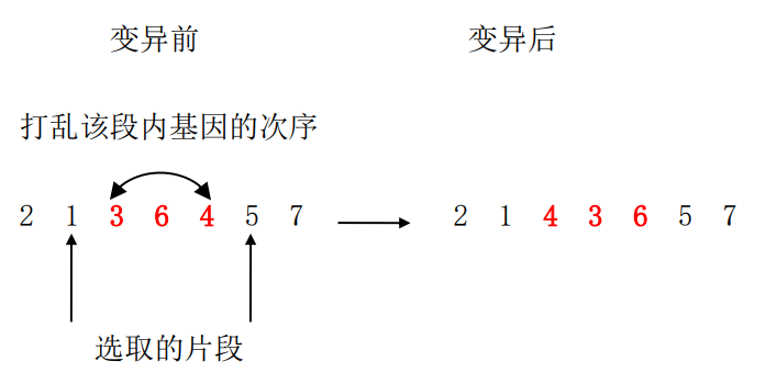 变异操作按照概率令某个基因发生突变,对于二进制编码来说,被选中的基因由0变成1或者由1变成0,取决于变异时该基因的取值。对于整数编码来说,有基于位置的变异,该方法随机选择两个基因,将第二个基因放置到第一个基因之前。基于次序的变异方法则是调换两个基因的位置。而打乱变异则是随意打乱两个随机产生的位置之间的基因顺序,逆序交换法是该方法的一个特例。