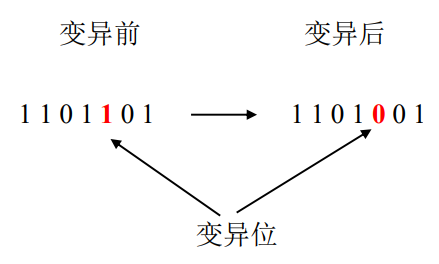 在二进制编码情况下,变异方法比较单一,一般是随机地产生一个变异位,被选中的基因如果是“0”则变为“1”,如果是“1”则变为“0”。比如下面这个例子,假定变异发生在染色体的第五位,则对于如下的二进制编码,变异前后的变化如下: