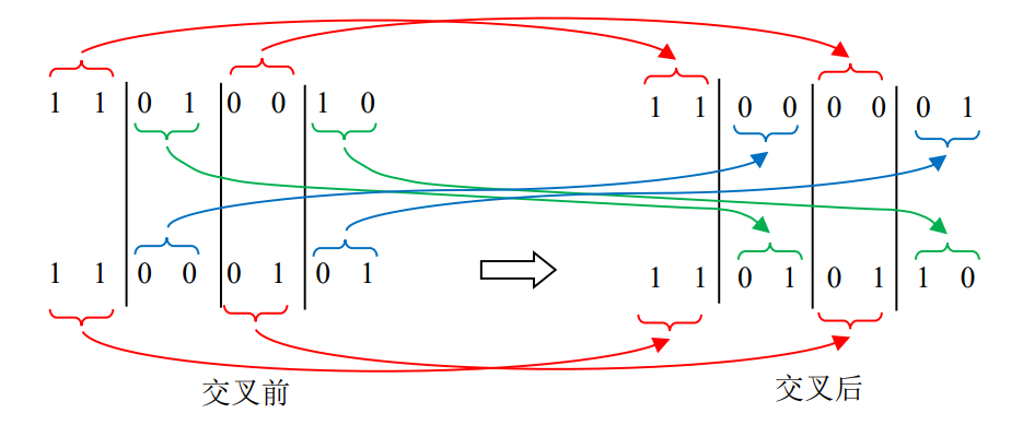 对于二进制编码,交叉操作有双亲双子法,该方法随机产生一个交叉位,交叉位将双亲染色体划分为前后两部分,两个双亲前后部分的不同组合拼接构成了两个后代的染色体。多位交叉法是该方法的推广,每次随机产生多个交叉位,将双亲染色体划分为多个片段,从一个双亲中选择奇数片段,另一个双亲中选择偶数片段,拼接在一起后就构成了两个后代。