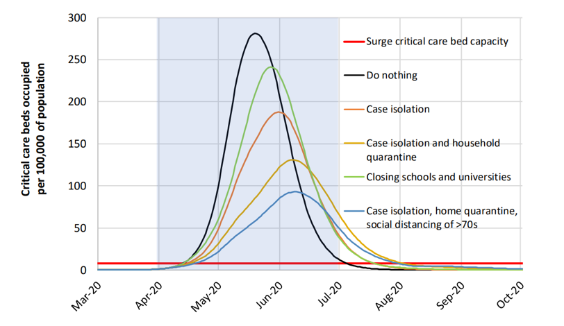 图1:伦敦帝国学院的新冠疫情应急小组对英国疫情发展所需ICU床位的预测[2]