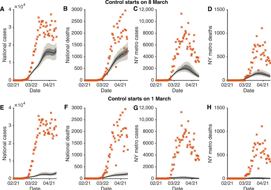 图2:如果早一个星期(上面四幅图)或早两个星期(下面四幅图)采取干预政策,美国和纽约的感染和死亡病例可能会显著下降[5]。