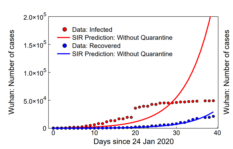 图3:MIT研究组关于武汉疫情的模拟。红线为如果不采取封城措施会引发的大量病例爆发。