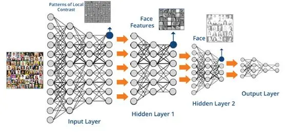 革命性的变革发生在2006年,Geoffrey Hinton 在Science上发表了一篇文章[2],提出了一种预训练方法来训练多层神经网络。他首先利用一种叫RBM的生成模型来提取数据中的显著特征,并将得到的特征送入另一个RBM,提取更高级的特征。这样一层层学下去,就得到了一个深度神经网络的“原型”,层次越深,学习到的特征就越高级。以人脸图片为例(图2),在较低层次学到的特征可能只是一些简单的线条,再深一层可能学到口鼻等构件的模样,再深层会学到人脸的大致轮廓,等等。有了这个原型网络,再结合人脸识别这一目标任务进行微调(称为Fine Tuning),即可得到非常强大的人脸识别模型。