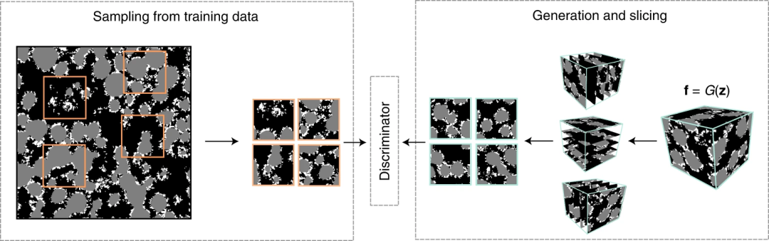 直接用G生成的数据来训练区分器D是有问题的,这是因为G生成的是三维结构,而真实数据是二维的,区分器D无法对一个三维结构和一个二维图片进行比较和区分。为了解决这一困难,SliceGAN采用了一种“切片法”,首先将生成的三维结构从三个方向切成若干二维面,区分器D对这些切片进行真实与否的判断。