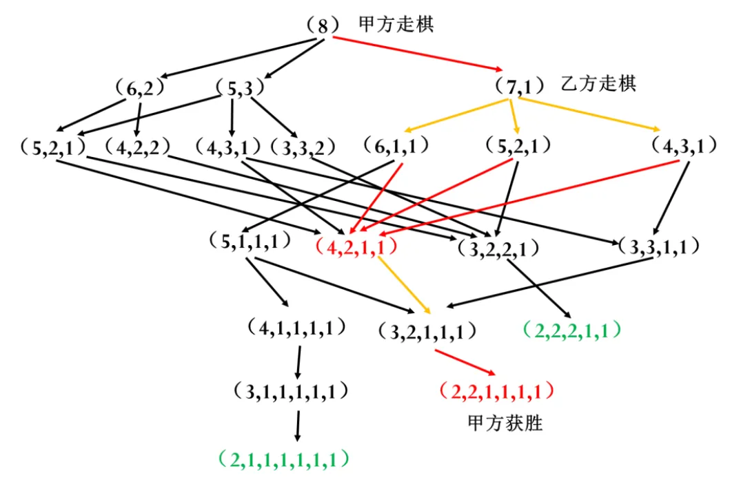 艾博士指着图说:甲方如果按照红色箭头走成(7,1),则乙方只能选择“7”这堆,将“7”分成(6,1)或者(5,2)或者(4,3),也就是图中按照黄色箭头得到(6,1,1)、(5,2,1)、(4,3,1)。无论对于这三种情况的哪一种,甲方都可以按照红色箭头选择行棋到(4,2,1,1),比如乙方行棋到了(6,1,1),则甲方将“6”分成(4,2),如果乙方走的是(5,2,1),则甲方将“5”分成(4,1)即可。而一旦甲方走到了(4,2,1,1),则乙方只能行棋到(3,2,1,1,1),这时甲方只需将“3”分成(2,1),得到(2,2,1,1,1,1),则乙方无棋可走,必输无疑。也就是说,对于这样一个分钱币游戏,甲方是存在必胜策略的。