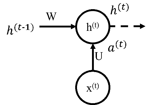 以自然语言处理为例,假设一句话是由n个单词组成的序列 x^(1) ... x^(n) ,每个单词构成了序列的基本组成单元。现在把这句话的每个单词依次输入到一个神经网络中,我们希望网络会依这些词的输入顺序生成合理的输出。循环神经网络通过一个内部状态单元(记为h)来实现这一能力,如下图所示。