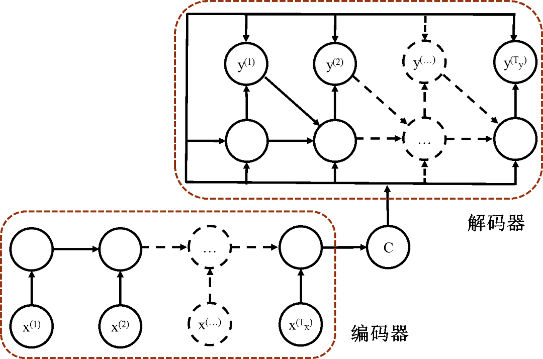 机器翻译的目的是将源语言的句子翻译成目标语言,如将中文翻译成英语。在这一任务中,机器需要读入中文的句子,理解其语义,并将其转译成英语。RNN可以帮助我们完成这一任务。如图3所示,可以设计一个编码-解码模型,该模型由两部分组成,第一部分是编码器,由一个循环神经网络将中文句子“编码”成一个向量C;第二部分是解码器,由另一个循环神经网络对C进行解码,依次得到英文的单词输出序列 y^(t) 。