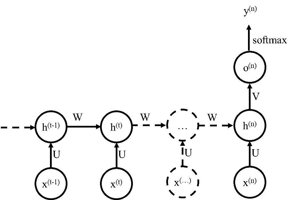 在情感分类任务中,一句话的情感表达在整句话的遣词造句中,单个词是不能完整表示情感的。因此我们需要将一句话有顺序地压缩到一个向量中,并基于此进行分类。RNN恰好可以实现这种有序压缩。如图2所示,经过循环神经网络对一句话进行压缩,到句尾得到向量表示 h^(n) ,该向量即表达了整句话的语义信息。对 h^(n) 再经过一个全连层得到输出 o^(n) ,最后再经过softmax激活函数即可得到情感预测的结果y。除了情感分类,这一方法可以也可以用于其它文本分类任务中,如文档类型划分,正负面新闻分类等。