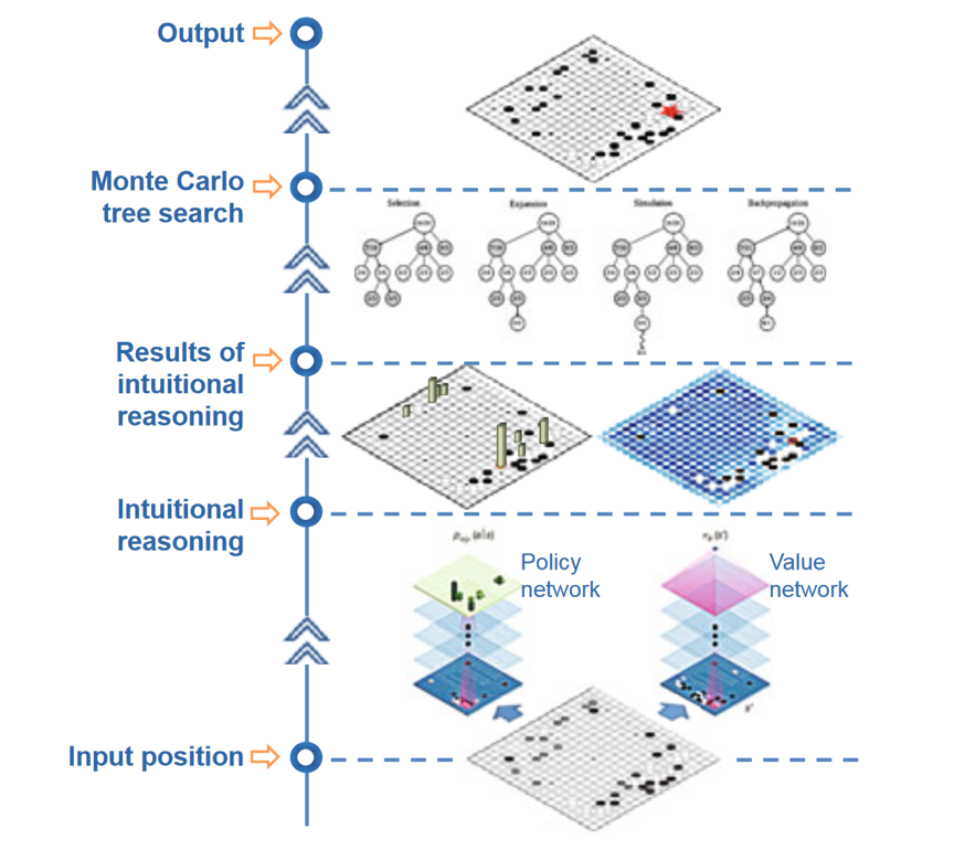 AlphaGo将深度学习方法引入到蒙特卡洛树搜索中,主要设计了两个深度学习网络,一个为策略网络,用于评估可能的落子点;另一个为估值网络,可以对给定棋局的胜负进行估值。AlphaGo将这些信息融合到盘面估值、节点选择和模拟走棋过程中,实现了更高效的搜索和更准确的估值,从而进一步提高了围棋程序的棋力。在训练过程中,AlphaGo学习了人类3000万步走棋,还把增强学习和自我对弈引入到模型训练中,有效提高了深度神经网络模型的精度。